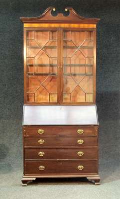 the swan neck pediment above astragal glazed doors enclosing three adjustable shelves, the deeper base with fall flap enclosing fitted interior, above four long graduated drawers on ogee bracket feet