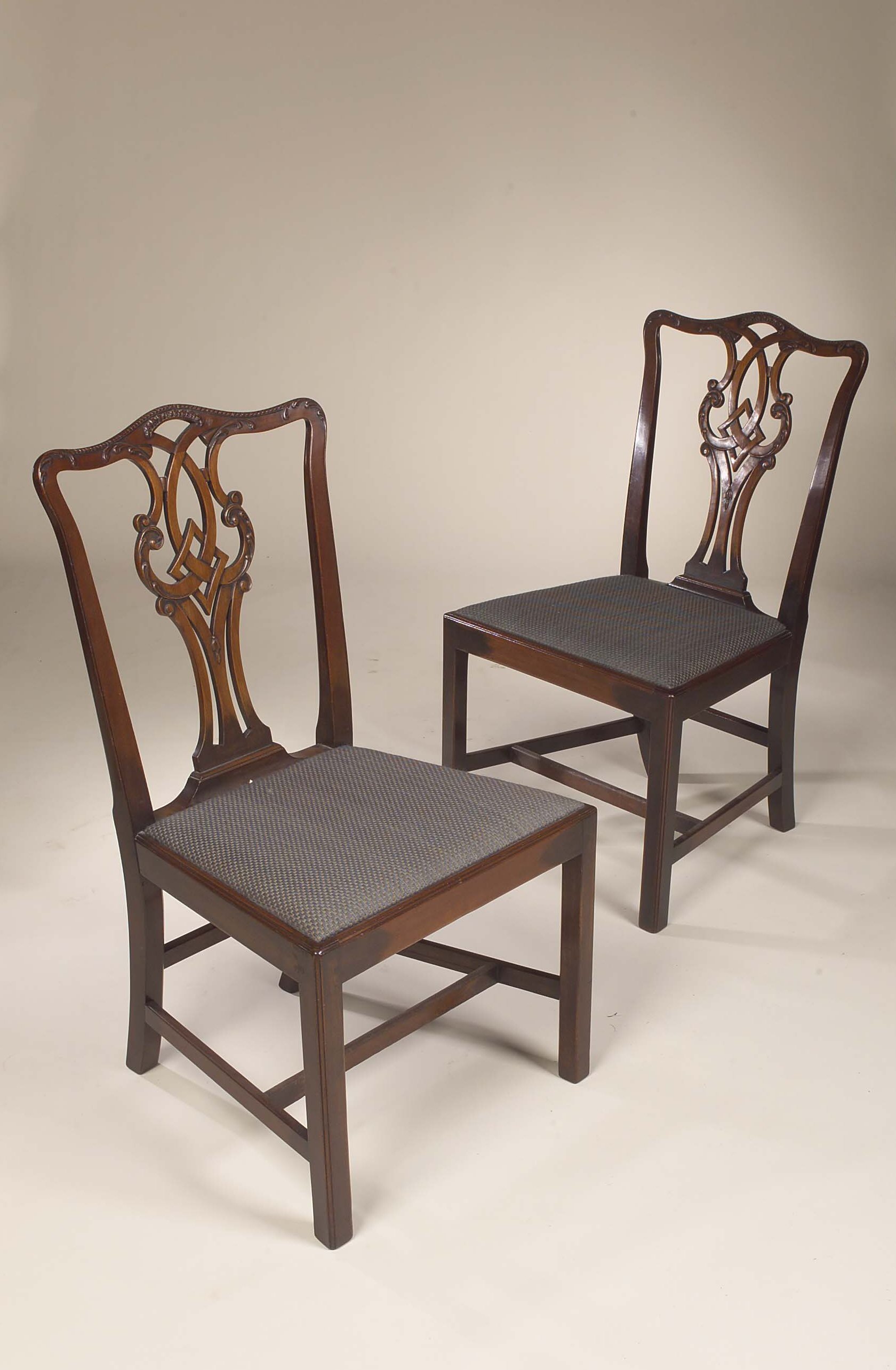 each with carved serpentine top rail above pierced interlaced splat, the drop-in seat on square chamfered legs joined by an H-stretcher (6)