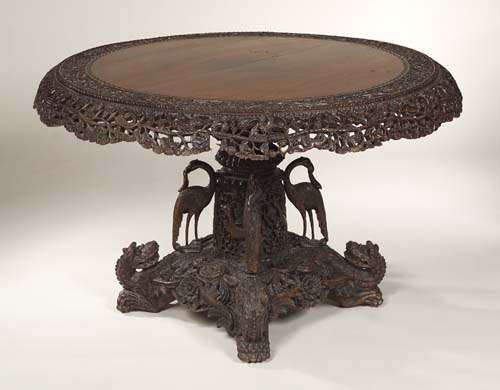 the circular tilt top with relief carved border of scrolling vine and birds and corresponding pierced apron, the pedestal elaborately carved with birds and vine and foliate crown, flanked by four carved birds with fish in their beaks, on squared base with carved and pierced decoration incorporating the scrolling tails of four dragons whose heads and paws comprise the feet, with sunken castors