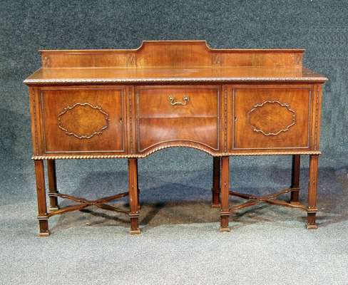 with a moulded splash back above a rectangular top over a central frieze drawer, flanked on either side by a beaded cupboard, with gadrooned skirt, on chamfered legs with block feet united by shaped X-stretcher