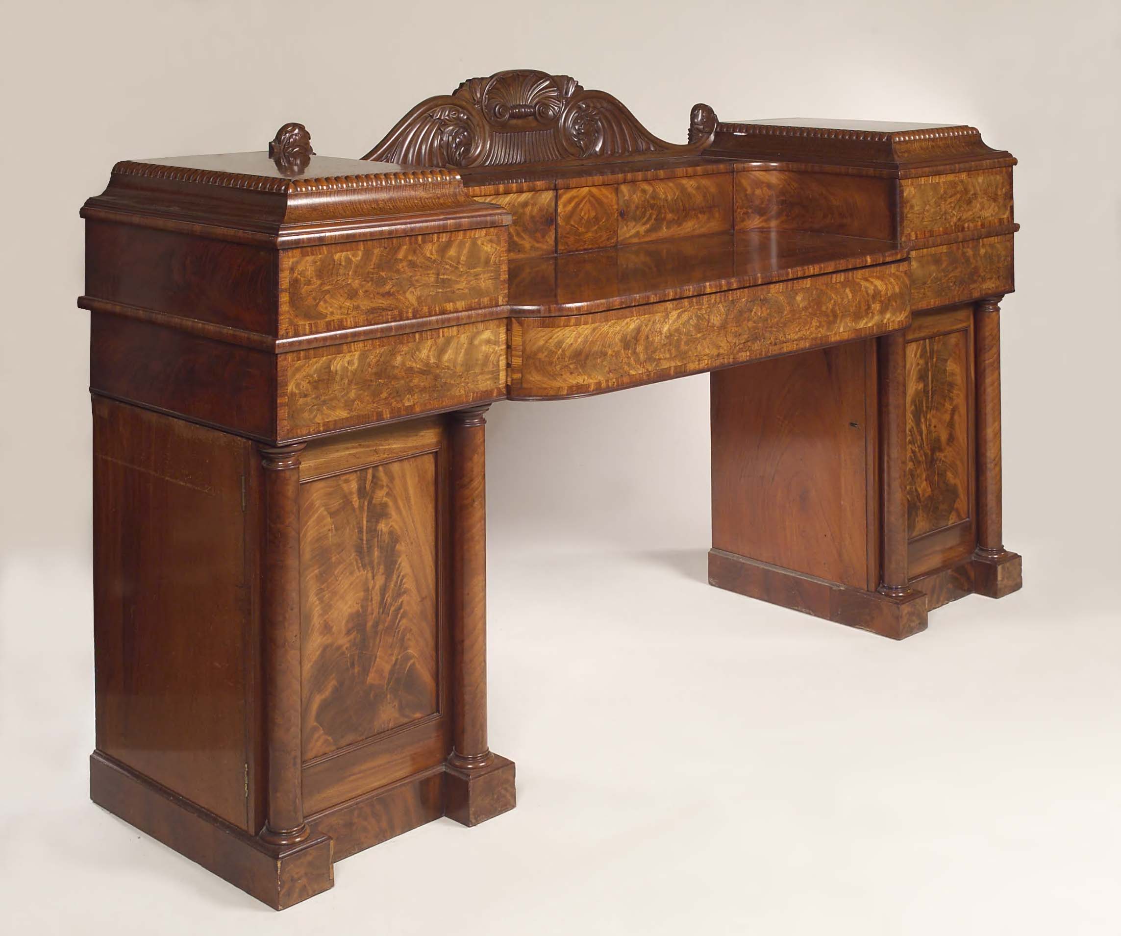 the reverse breakfront stage with scrolling leaf carved ledge back centred by shell, incorporating sliding doors and drawers, above frieze drawers, each pedestal with panelled door flanked by columns enclosing drawers, enclosing a well, matched later glazed section to centre part, on plinth base
