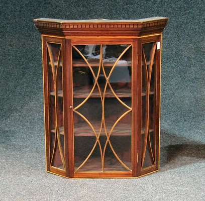 with a canted moulded dentil cornice over a glazed door, flanked on either side by glazed panels surrounded by ebony and boxwood stringing