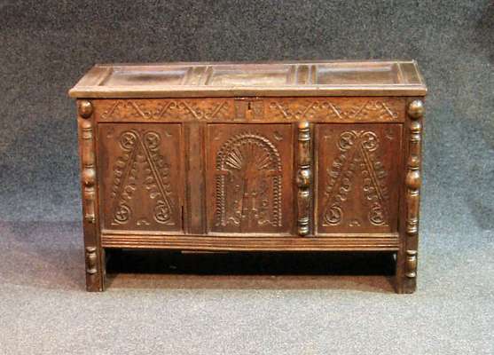 the hinged rectangular triple panelled top above a foliate carved frieze centred by the initials LW, the triple panelled front carved with foliate arched and stylised 's' motifs, on square supports