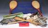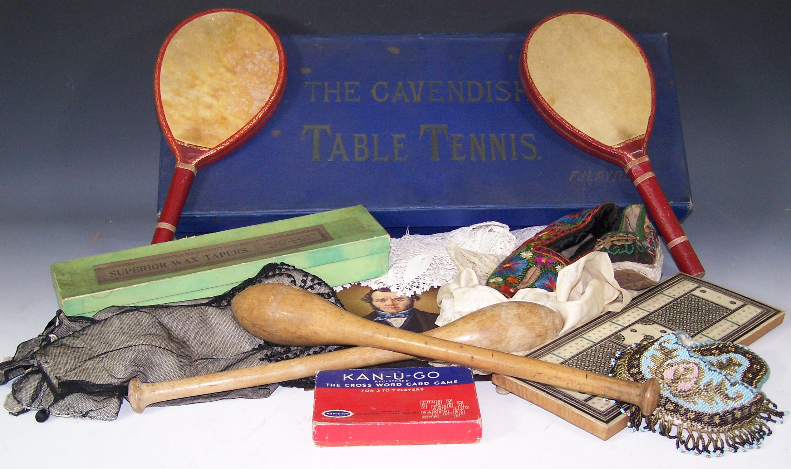 a collection of children's shoes; a quantity of unframed Victorian watercolour portrait studies; a variety of hat trimmings and hat pins; a selection of board games, including a boxed part Cavendish table tennis set; juggling batons; a boxed Aunt Sally game, etc (qty)