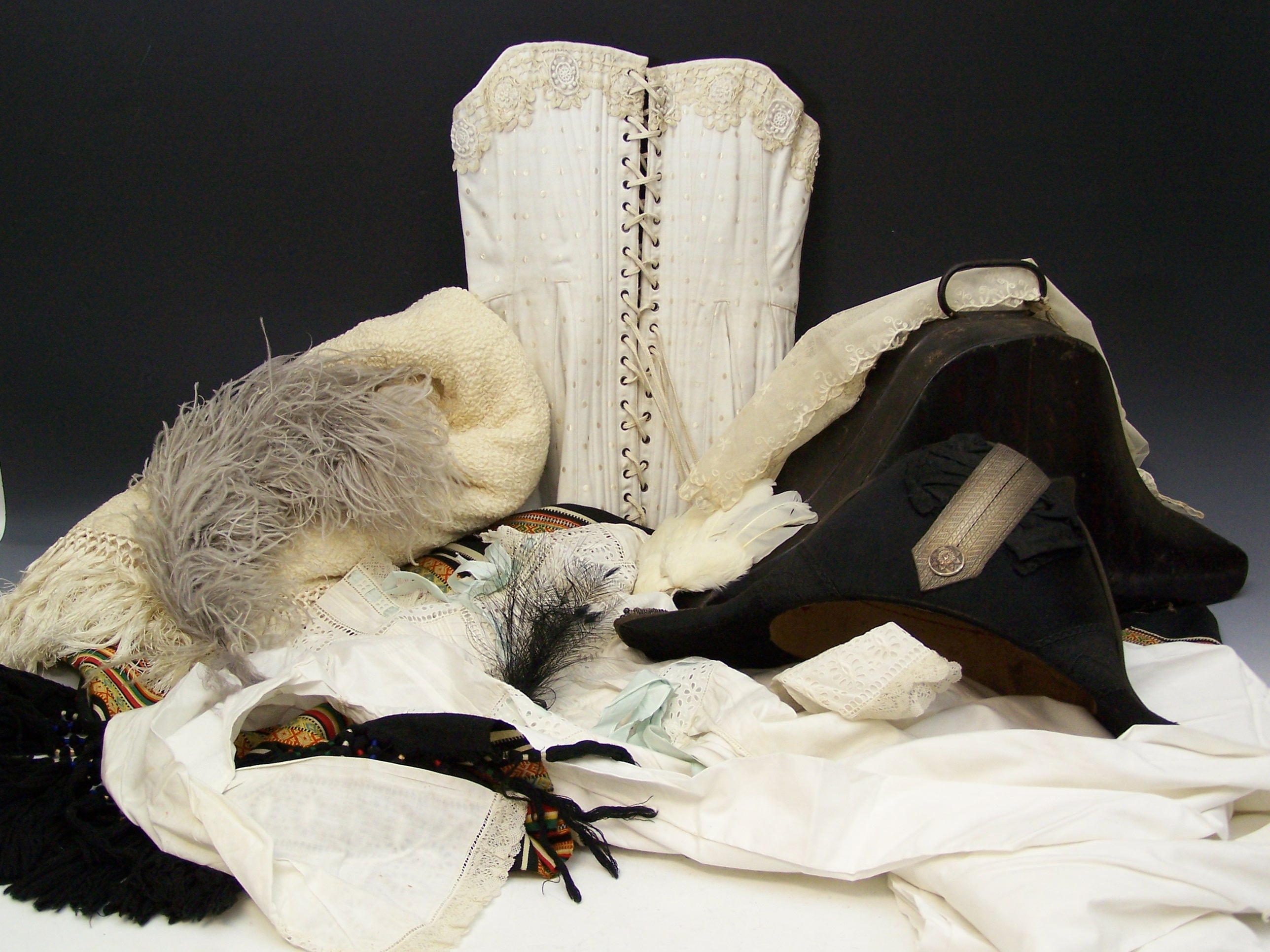 including: infant clothes; various cotton, lace and woollen household items; together with a 19th century bicorne hat, the badge marked with 'medical staff', in a shaped tin box; a box of feather accessories; a small box of lace; four various shawls; and various other household cottons, etc
