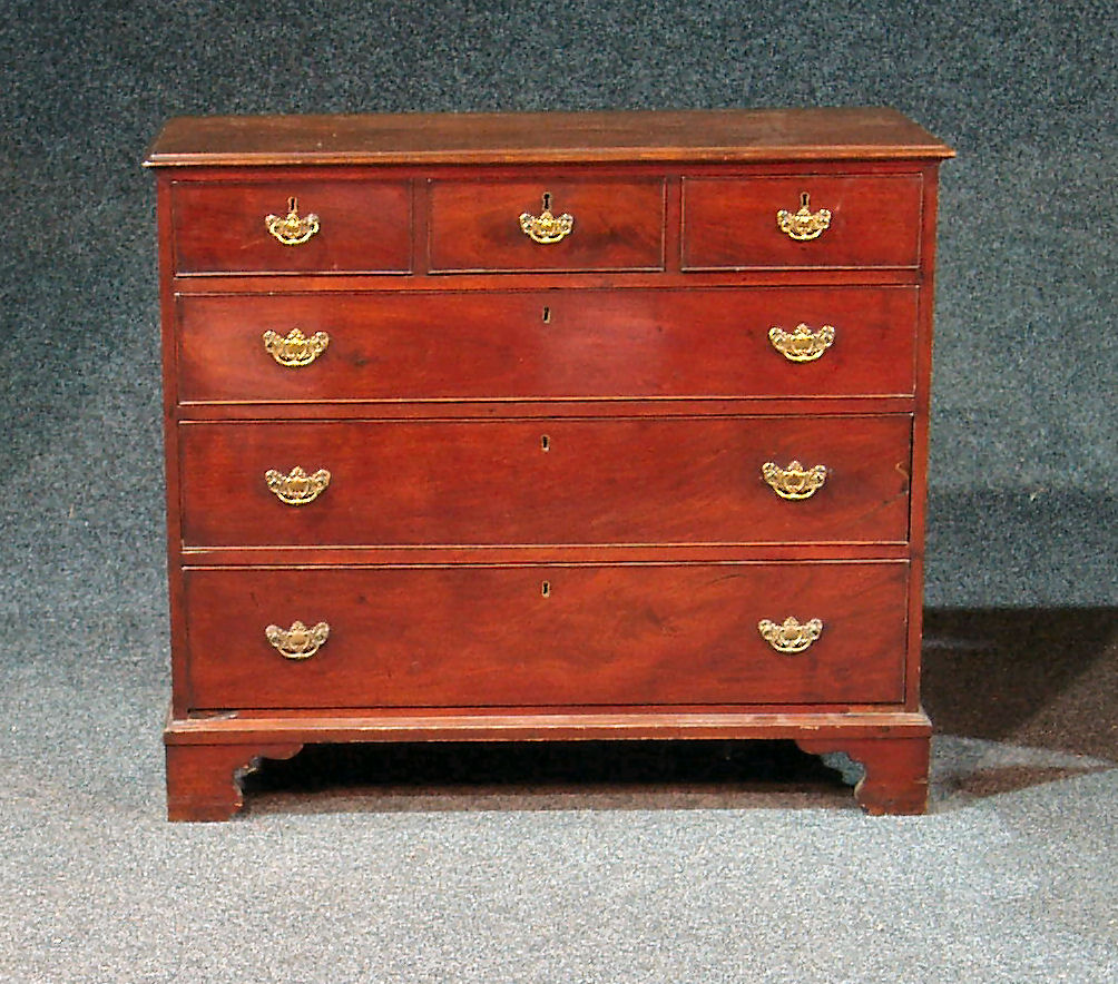 the moulded rectangular top above three short and three long drawers on bracket feet