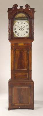 the twin train movement with anchor escapement striking on a bell, false plate W FRANCIS, BIRMINGHAM, the arched dial painted with castle and flowers to the spandrels, with subsidiary seconds dial and date aperture, the hood with swan neck pediment and turned columns, the case with chequer strung panelled trunk, the corresponding base on ogee bracket feet