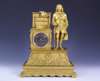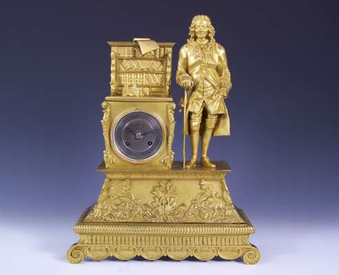 the silvered dial (worn) contained within stylised chiffonier on broader acanthus cast spreading plinth supporting figure of Voltaire on shell cast feet