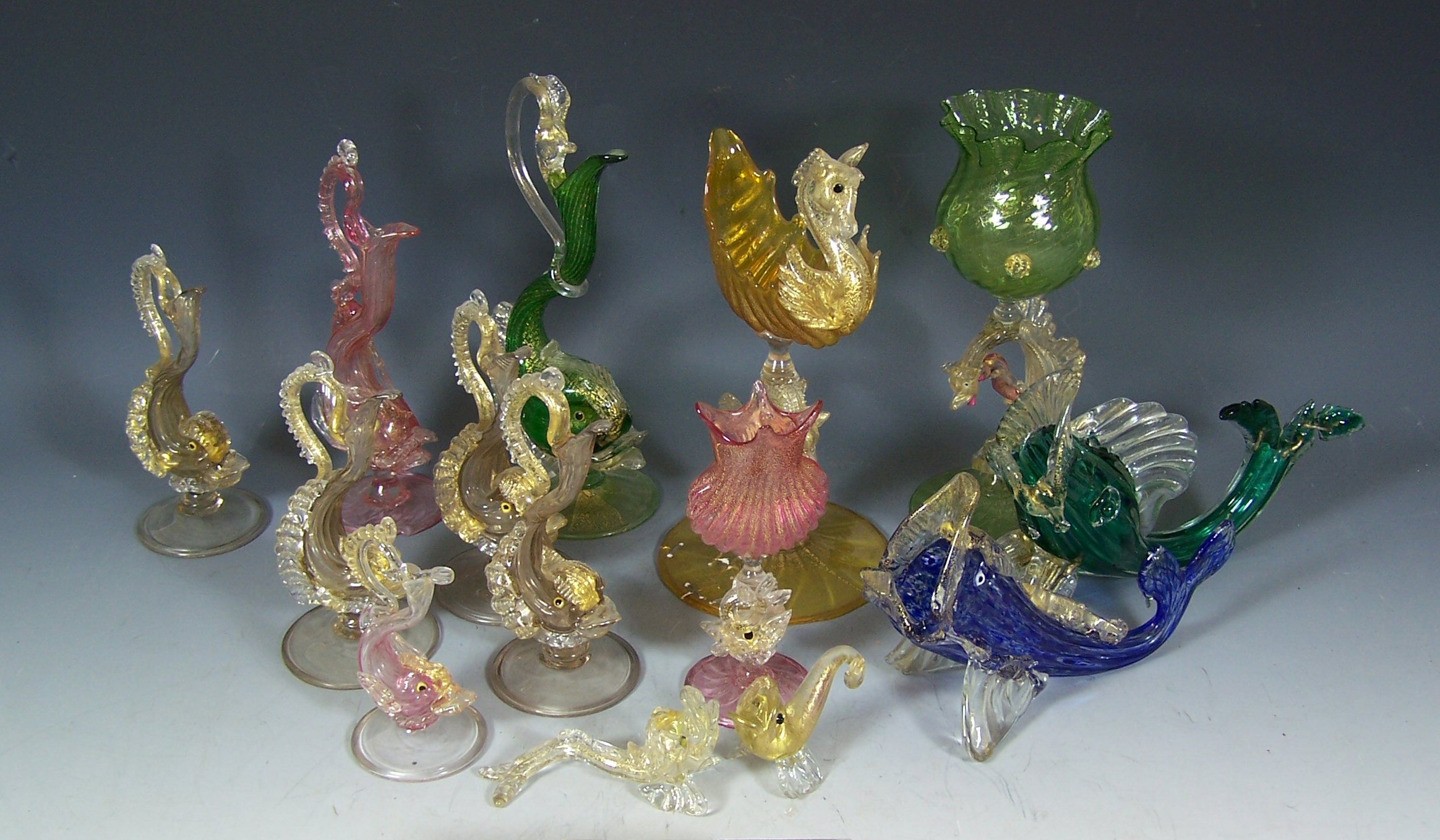 comprising: four clear glass and gilt dolphin form jugs, 15cm high; an orange, clear and gilt seahorse and dragon form dish, 22cm high; a green and clear vase with dragon form stem, 21.5cm; and seven various dolphin form jugs and vases (14)