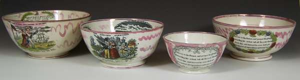comprising: a bowl with 'July' to the centre, 'Crimea' with armorial devices to the exterior together with various poems and pictures, 25cm diameter; another bowl 'The Sailor's Farewell' with poems and images, 22cm diameter; a smaller bowl, with armorials to one side and poem 'To the Farmer' on the other, 15.5cm diameter; and a bowl with 'Success to the Farmer' and commemorating the Sunderland Bridge, 22.5cm diameter (4)