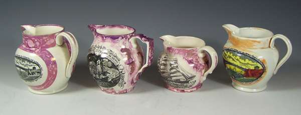 comprising: a jug, decorated with 'Bon Homme Richard and the Serapis 1779' on one side and 'Commodore John Paul Jones' to the other, 14cm high; a small jug, 'The Sailor's Tear', 11cm high; and an orange lustre ware jug, decorated to one side with 'The Sailor's Tear' and to the other with West View of the Cast Iron Bridge, 13cm high; and another jug 'May peace and plenty...', 14cm high (4)