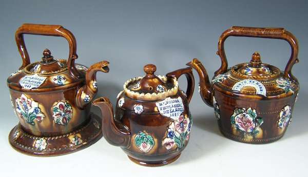 decorated with floral motifs and a shield embossed 'MRS FORBES FROM ASHBY DE-LA ZOUCH 1887', 20cm high; together with another tea kettle; and a teapot, similar (4)