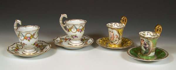comprising: six cups and six saucers, decorated with floral and gilt swags above small floral motifs, each handle in the form of a mythological animal; together with a similar continental part coffee set, decorated with figural cartouche panels (28)