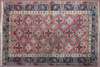 the red field with allover pattern of white and blue cruciform medallions and hooked lozenges, within indigo palmette and serrated leaf border between ivory and striped bands