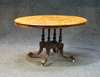 the moulded oval top with foliate and bird marquetry, on four baluster turned supports to shaped platform with four carved sabre legs on ceramic castors