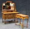the shaped mirror between square reeded supports, above gallery flanked on either side by a short drawer, the rectangular top above banks of three, two and one drawers, on baluster legs and bun feet united by an X-stretcher, 122cm wide ; and a matching side table, stamped 'Marsh Jones and Cribb Ltd, Leeds', the rectangular top over a single frieze drawer and shaped apron, on baluster turned legs and bun feet united by an X-stretcher, 84cm wide (2)