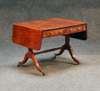 the hinged twin flap rectangular top above two drawers opposing two dummy drawers, the end supports joined by a turned pole stretcher, on moulded sabre legs ending in brass caps and castors