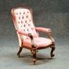 the moulded frame with foliate carving over a pink upholstered back and seat, the open arms on foliate carved S-scroll supports, on cabriole legs with C-scroll feet