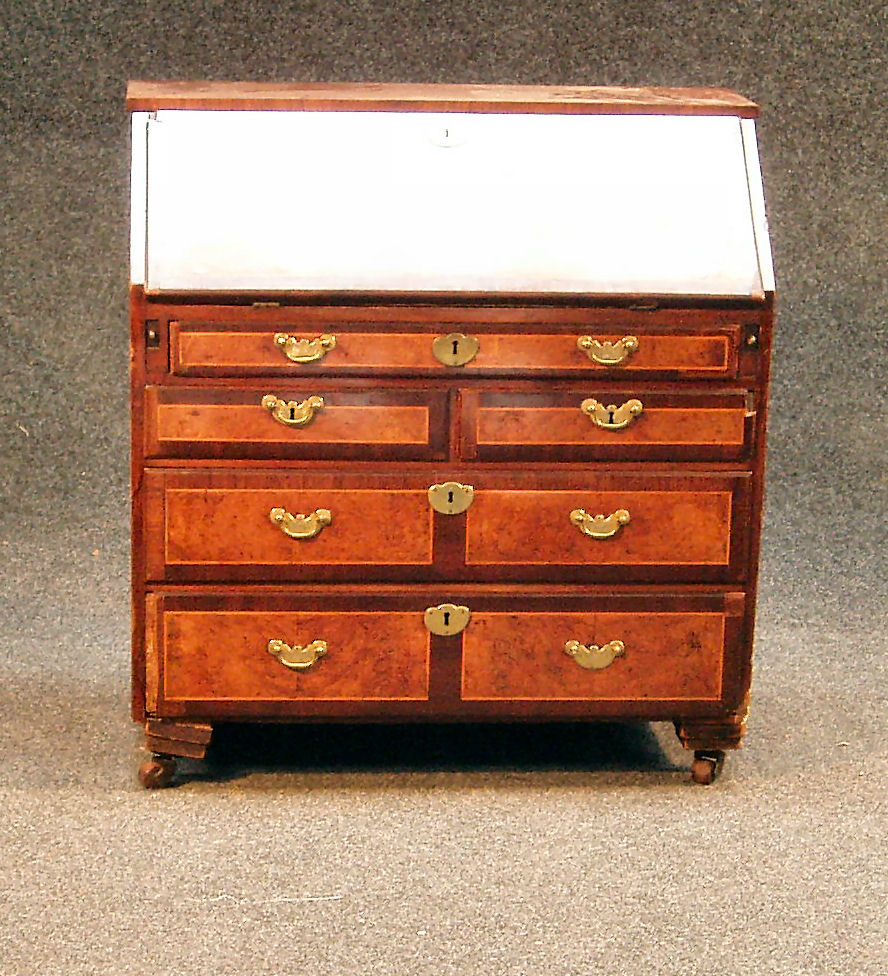 the walnut panelled fall flap enclosing a fitted interior, over a conforming long drawer over two short over two long graduated drawers, on block feet 96cm wide