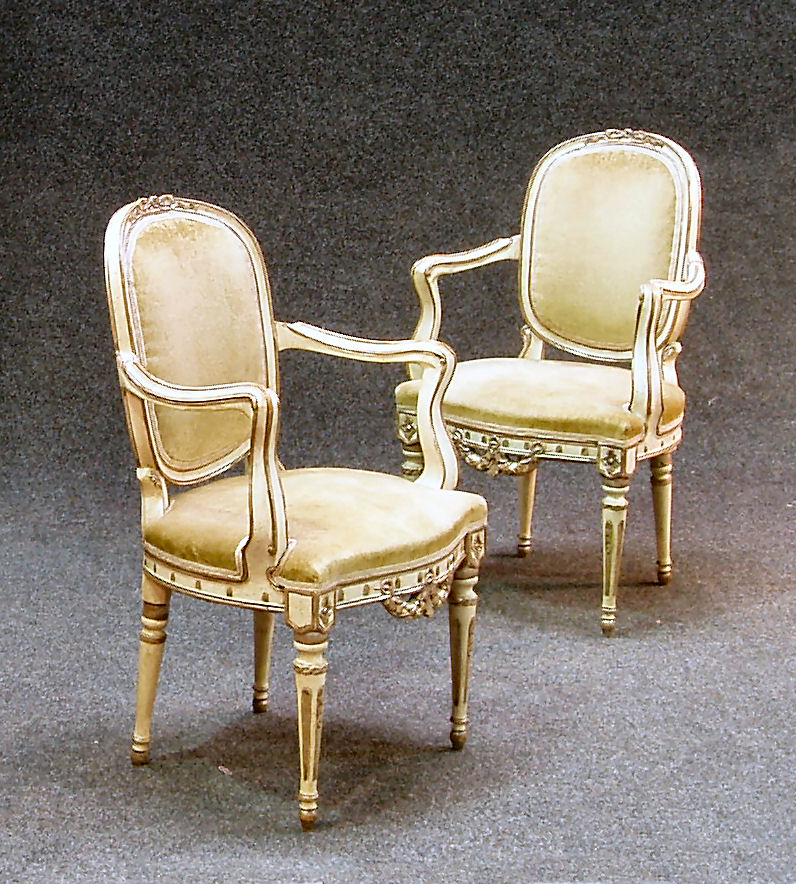 A pair of French silvered fauteuils,