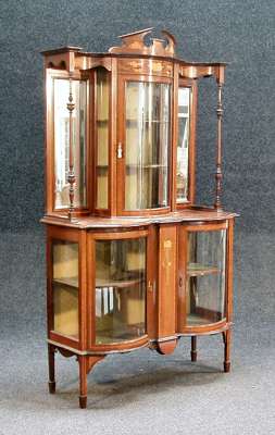 the broken pediment above a floral marquetry frieze and glazed door enclosing shelves, flanked on either side by a mirror and turned supports, over a central floral marquetry panel flanked on either side by a bowfronted glazed door, on square tapering legs with spade feet
