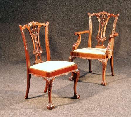 each with a foliate carved shaped top rail over pierced central splat with swags, the drop-in seat on acanthus headed cabriole legs with claw and ball feet; including two matching carvers (8)