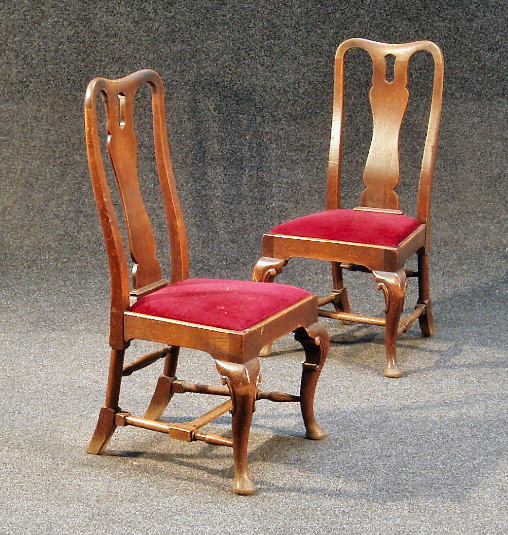 Alteration. Not eight as catalogued. each with a shaped top rail over a vertical solid vase shaped splat, the drop-in seat on cabriole legs with pad feet, united by block and turned stretchers (7)