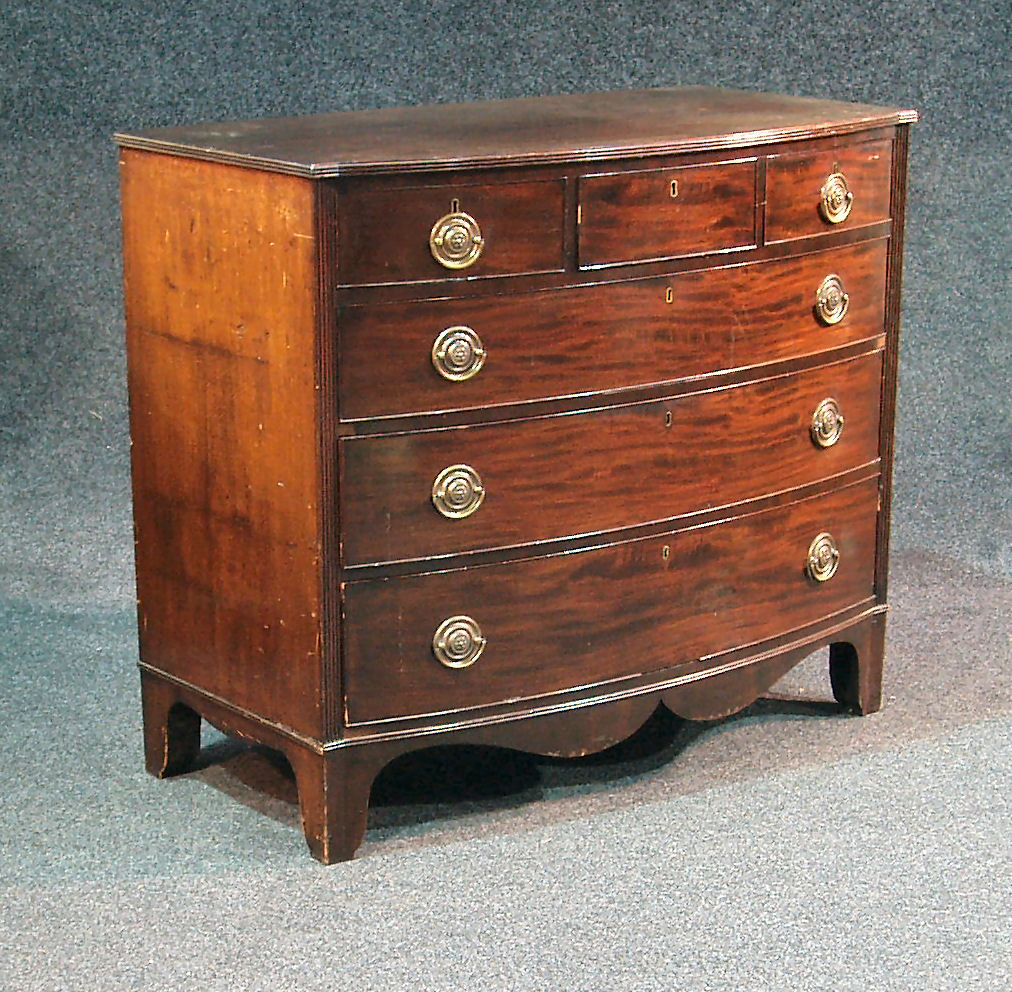 the moulded top above three short over three graduated long drawers, with a shaped apron, on bracket feet
