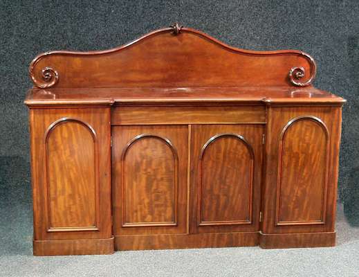 the serpentine back panel above the moulded inverted breakfront top, over a frieze drawer and two arched panelled doors, flanked on either side by corresponding cupboard, on plinth base