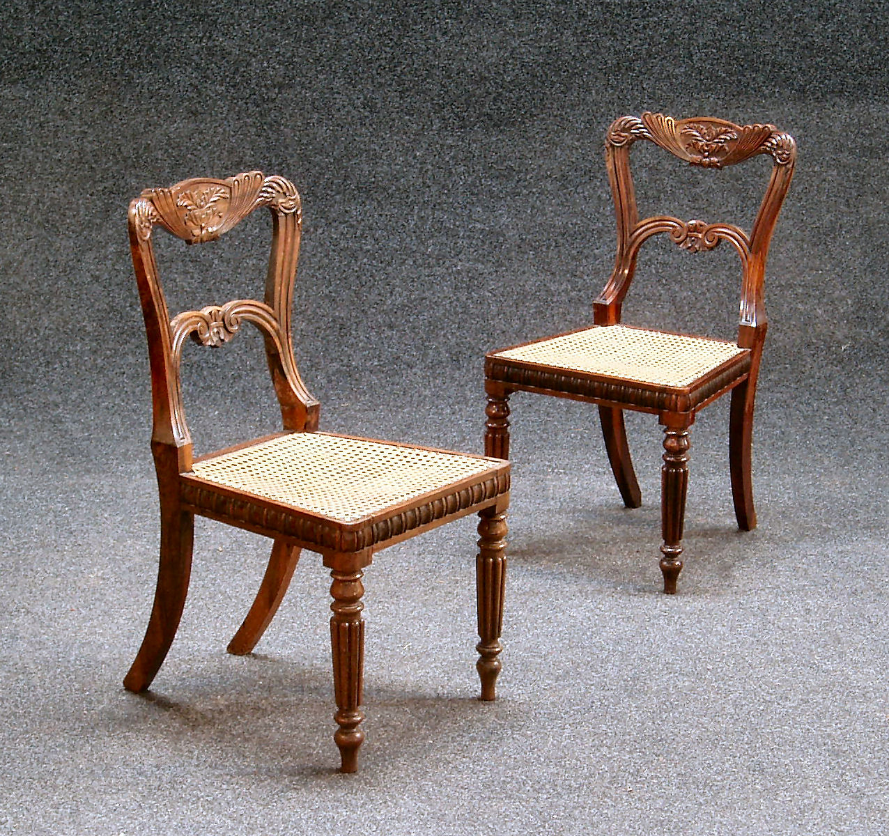 each with acanthus and foliate carved top rail over a single shaped splat on moulded supports, the caned seat on turned tapering reeded legs (5)