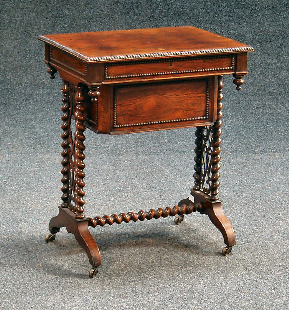 the beaded rectangular lid enclosing two tea caddies and three wells, over a beaded frieze panel, on spirally turned supports and down swept legs united by a spirally turned stretcher, on brass castors