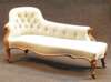 the buttoned back with foliate S scroll facings, the serpentine seat, on moulded cabriole legs with brass castors