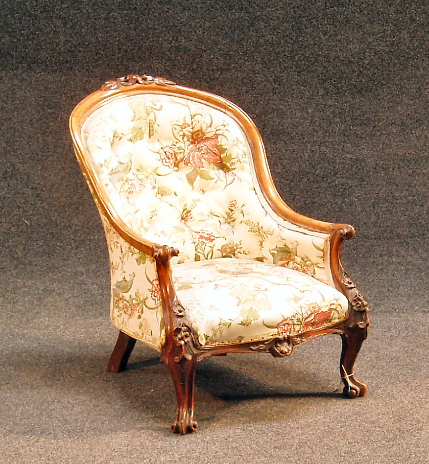 the moulded mahogany frame topped with foliate carving over scroll arms and shaped apron, on moulded cabriole legs with foliate carved knees and scroll feet