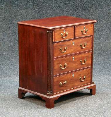 the moulded rectangular top above two short beaded drawers over three graduated beaded long drawers, flanked on either side by quarter fluted columns, on bracket feet