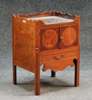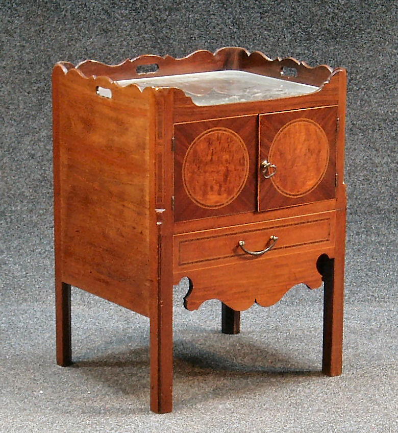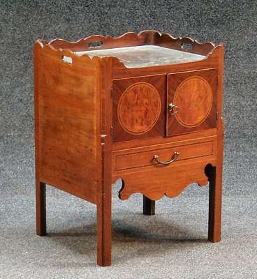 the shaped three quarter gallery with pierced handles, over two lozenge inlaid cupboards flanked by canted corners, over a single banded drawer enclosing well, with shaped apron on square legs