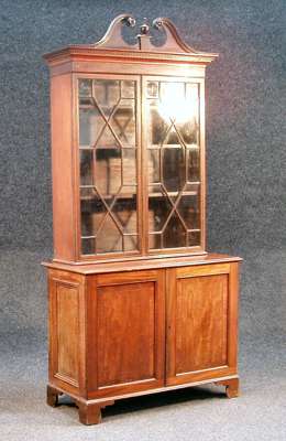 the swan neck pediment with central urn over dentilled cornice and boxwood strung frieze panel, above astragal glazed doors enclosing three adjustable shelves, on a matched moulded rectangular cabinet with two panelled doors enclosing two short drawers and two shelves, on bracket feet