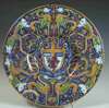 decorated in rich blues, greens, reds and gilt, with mythical beasts, scrolling foliage and with a coat of arms containing a lion rampant to the well, black painted cockerel mark (damages)
