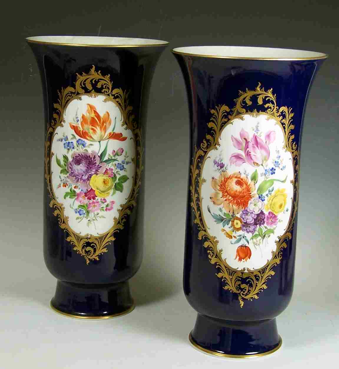 each of footed cylindrical form, dark blue, decorated with cartouche panels of summer flowers framed by gilt scrolling foliage, blue crossed sword mark (2)