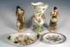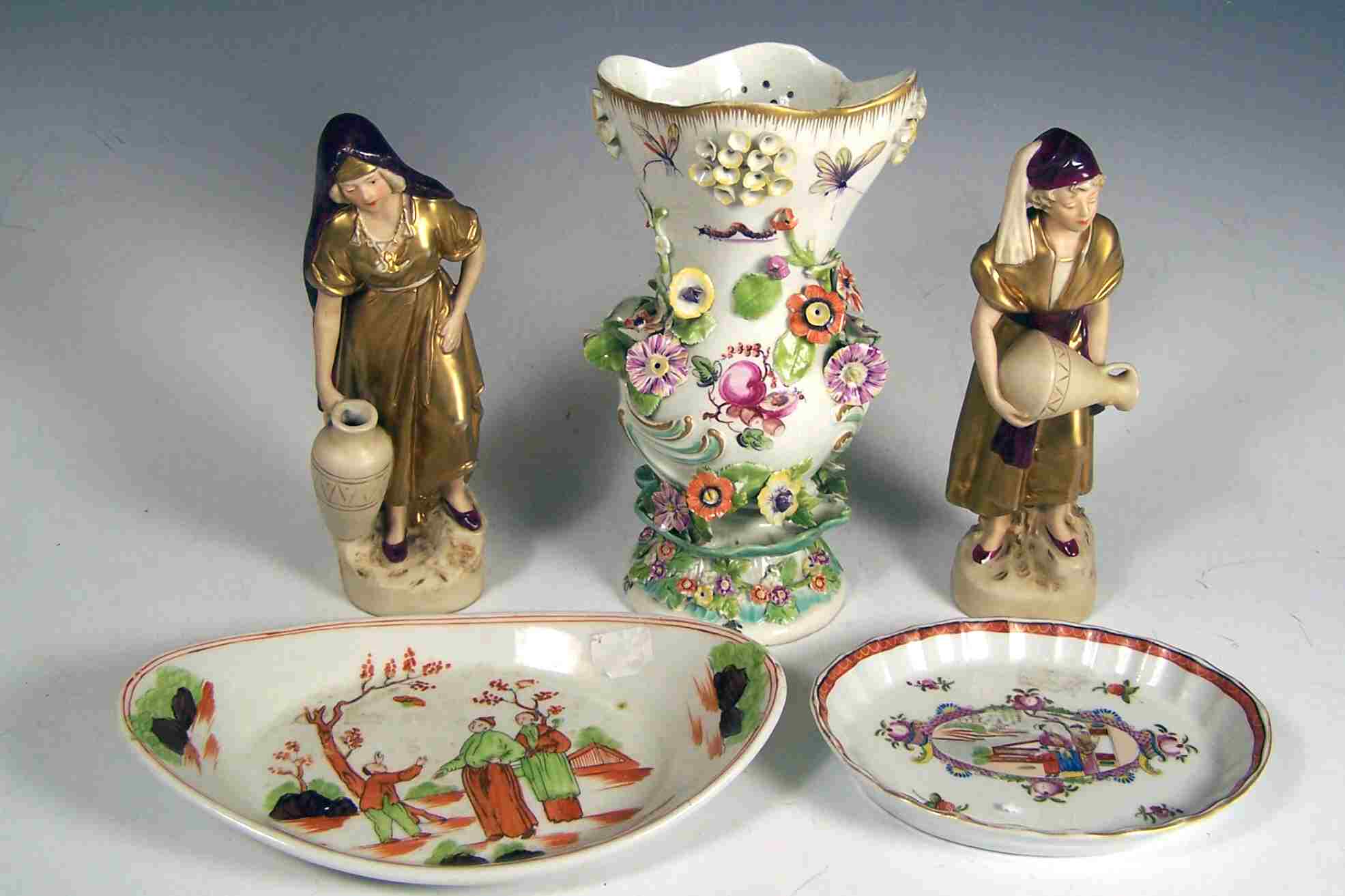 depicting a male and female water carrier, decorated with gilt and dark red, applied pink triangle, 19cm high; a rococo vase, decorated with moulded flowers and painted with a bird and fruit, 20cm high; and two English oval teapot stands, each decorated with a Chinese scene (5)