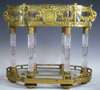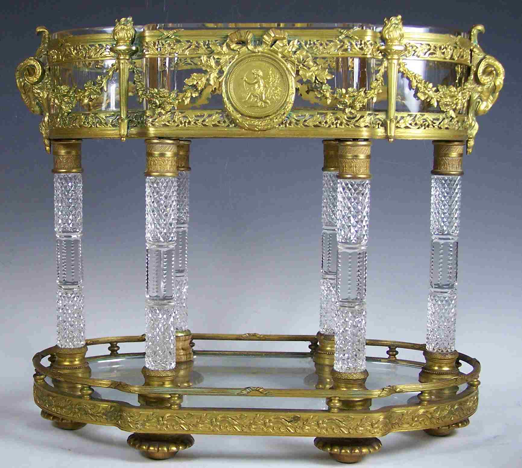 of stepped oval form, the brass mounted with swagged foliage and rams' heads raised on cut glass columns with six feet