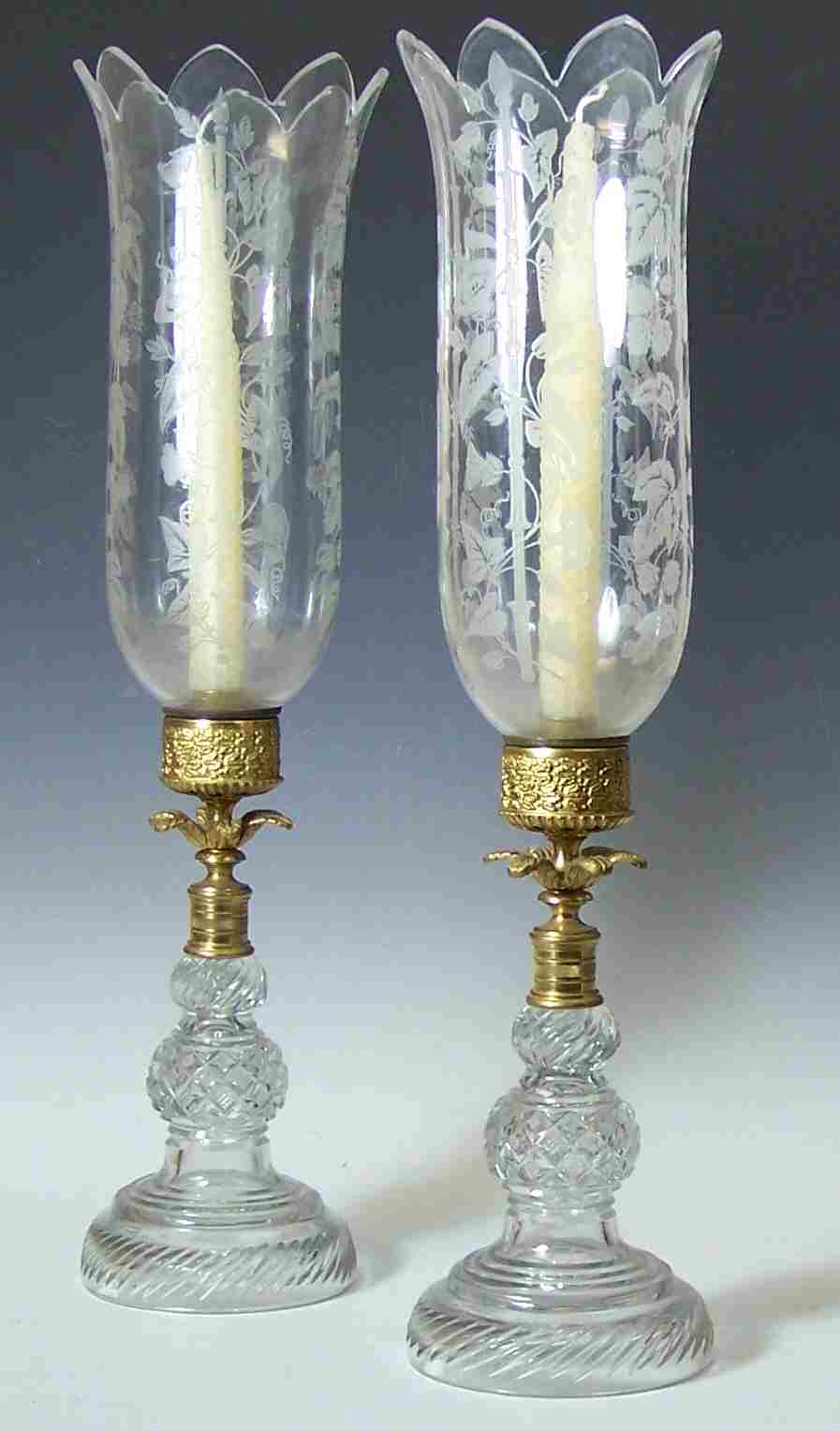 each having a glass cover with scalloped rim, decorated with foliage above a gilt metal mount with foliate decoration, on cut glass foot (2)