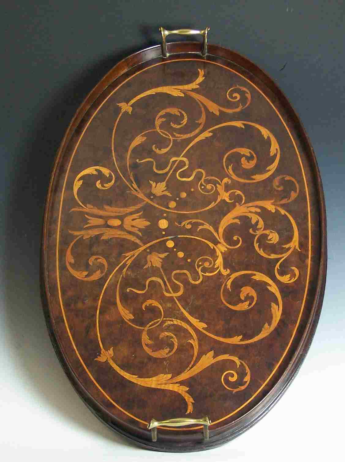 A mahogany and marquetry oval gallery tray,