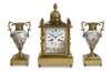 the circular enamel dial above a painted scene of two figures by a river, enclosed by four pillars, with acorn finial, 35cm high; together with a pair of matching twin handled vases (3)