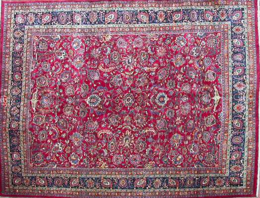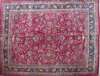 the claret field with allover scrolling palmette pattern, within indigo palmette and scrolling vine border between multiple bands, inscription to one end