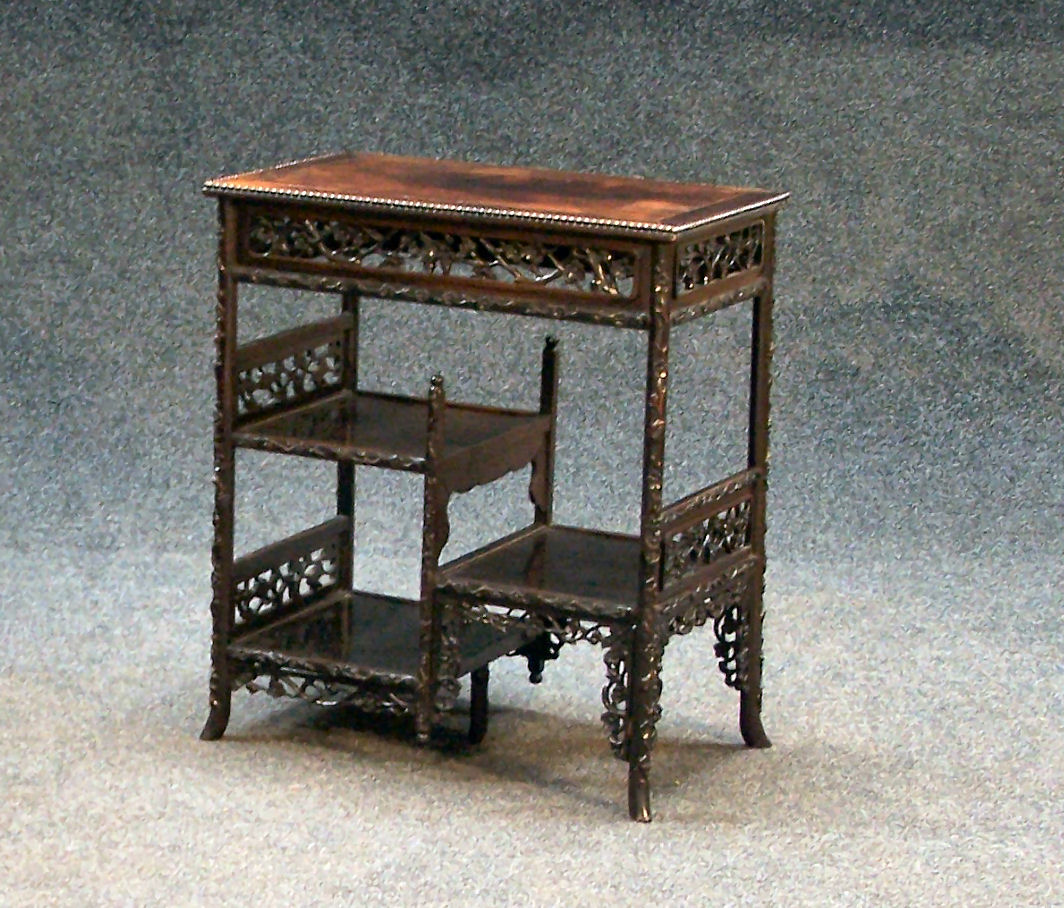 the beaded rectangular top over an open fretwork frieze panel, three foliate caved offset shelves, on carved turned legs