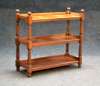 the three quarter gallery over three shelves, with finials surmounting block and reeded turned supports on bun feet