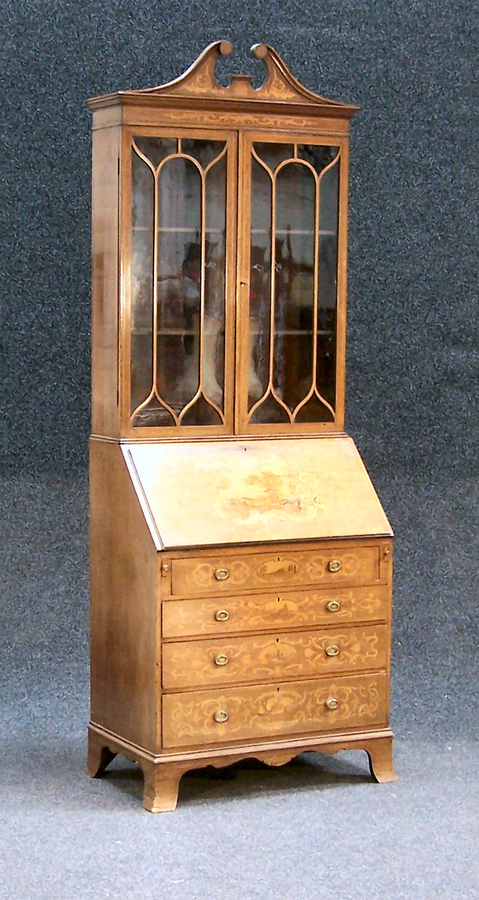 the broken pediment over a marquetry inlaid frieze and two astragal doors enclosing shelves, the fall inlaid with woodland scene enclosing a fitted interior, above four graduated long drawers, on shaped apron and bracket feet