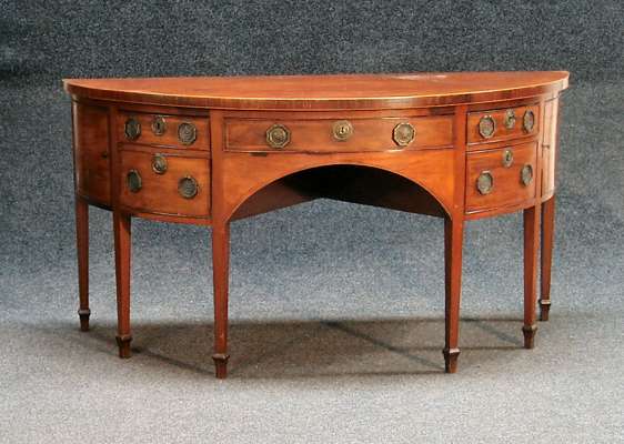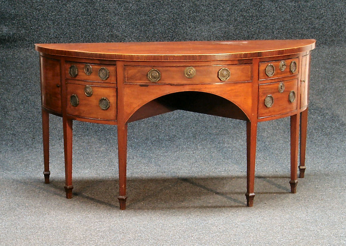 the banded top over a single frieze drawer, arched knee-hole, flanked by two short drawers and cupboard, on square tapering legs