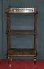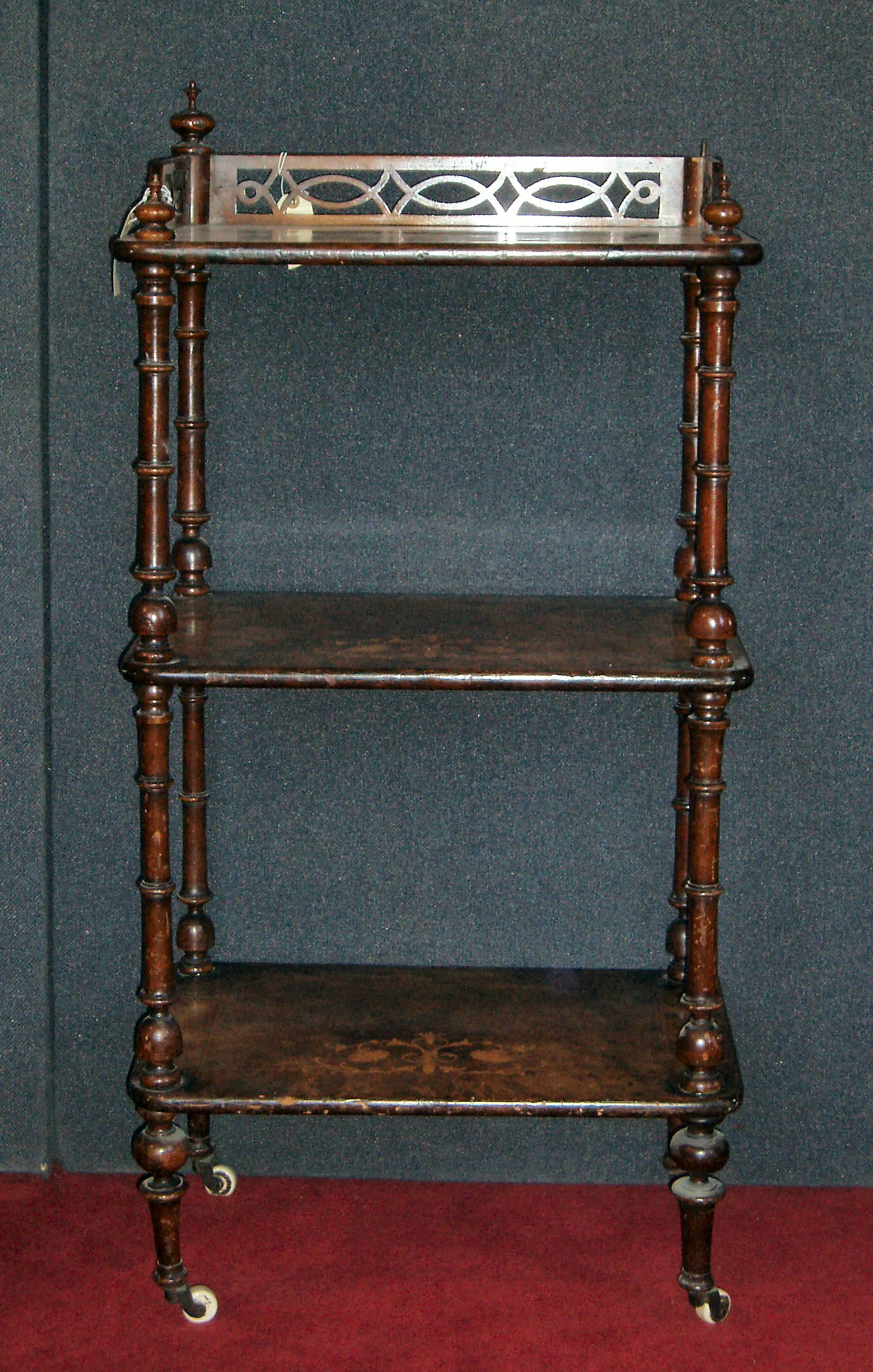with pierced three quarter gallery over three shelves on finial topped baluster turned supports and ceramic castors