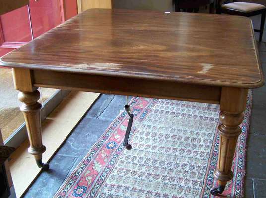 with two leaves, the rounded rectangular top above plain frieze on turned and fluted tapering legs with pot castors